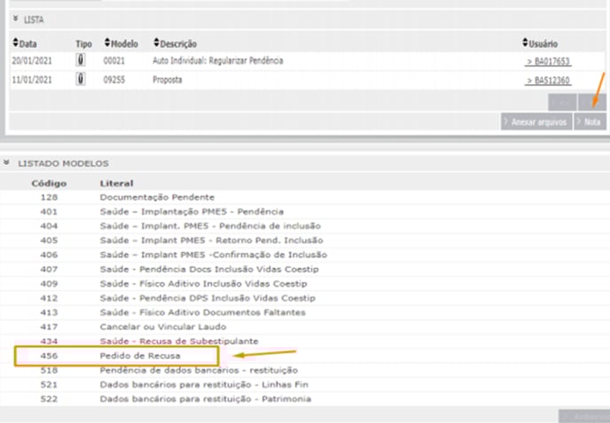 CANCELAMENTO DE PROPOSTA: O cancelamento é realizado diretamente no portal da cia. Na aba de consulta da proposta “Ficha gestão” > Nota > Clicar na lupa > Código 456 Pedido de recusa > Descrever a solicitação de cancelamento.