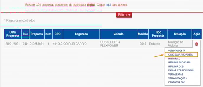 CANCELAMENTO DE PROPOSTA: O cancelamento é realizado diretamente no portal. Acessar o campo Propostas > Acompanhamento de proposta > Informar Número da proposta ou Placa para localizar a proposta. No campo “Ação”, clicar em cancelar proposta.